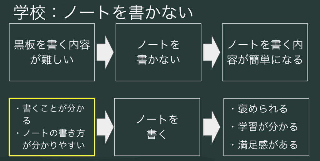 例えば画像にあるように、ノートを書かないという現状を変えたくて「ノートを書く」という行動を引き出したい場合について考えましょう。